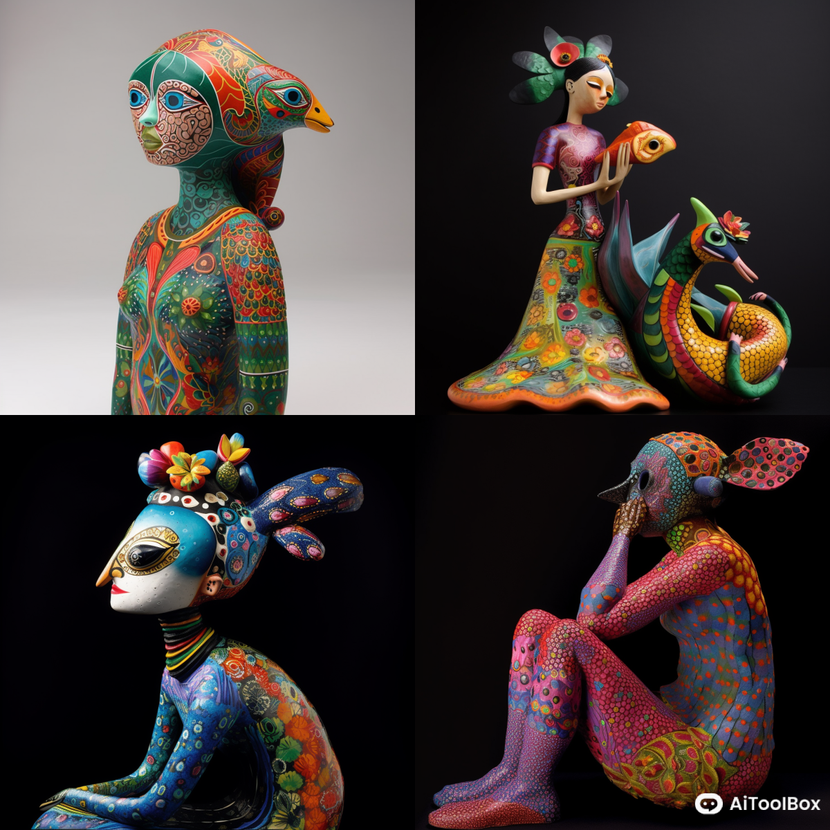 在Midjourney中源自墨西哥的手工艺品,通常由木材或纸糊制成,具有鲜艳的色彩和独特的造型。