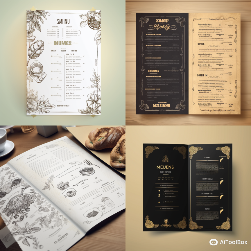 在Midjourney里面,"menu design" 是指为餐厅、咖啡馆、酒吧、酒店等场所设计的菜单。菜单设计可以影响消费者的点餐行为和体验,因此需要注重设计的美观性、易读性、布局、排版、材质等因素。菜单设计可以通过使用艺术设计、插图、排版、色彩等手段,突出菜品的特色和品牌形象,提高消费者的选择和消费积极性。在设计菜单时,需要考虑到目标受众、餐厅类型、菜品种类、价格、季节等因素,以确保菜单设计符合实际需求,并能够提供良好的消费体验。